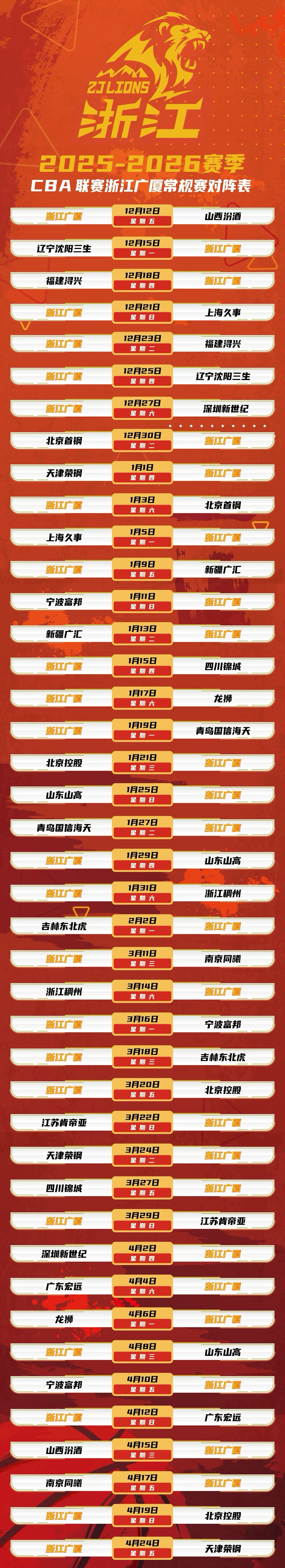 【杭州】2025-2026赛季CBA 浙江方兴渡男子篮球队主场赛事
