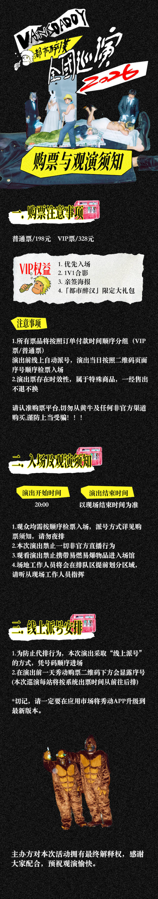 购买前请提前规划好行程,当天确保至少提前一小时到达现场,以免影响您正常观演,感谢您的理解与配合。
