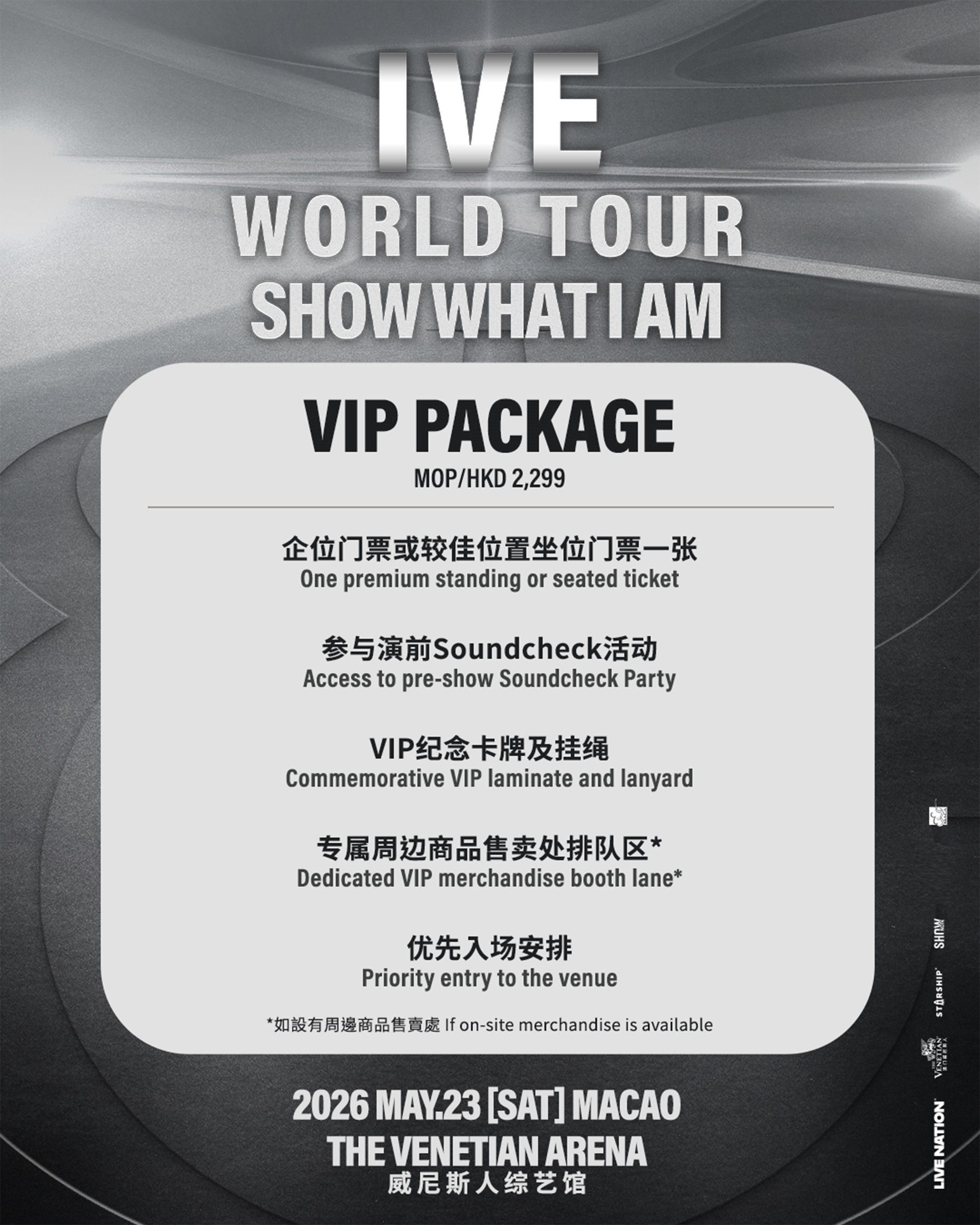 韩国人气团体 IVE (ANYUJIN, GAEUL, REI, JANGWONYOUNG, LIZ, 和 LEESEO),正式公布备受期待的第二次世界巡回演出《SHOW WHAT I AM》,将于 2026 年 5 月 23 日(星期六)在威尼斯人综艺馆盛大开唱。