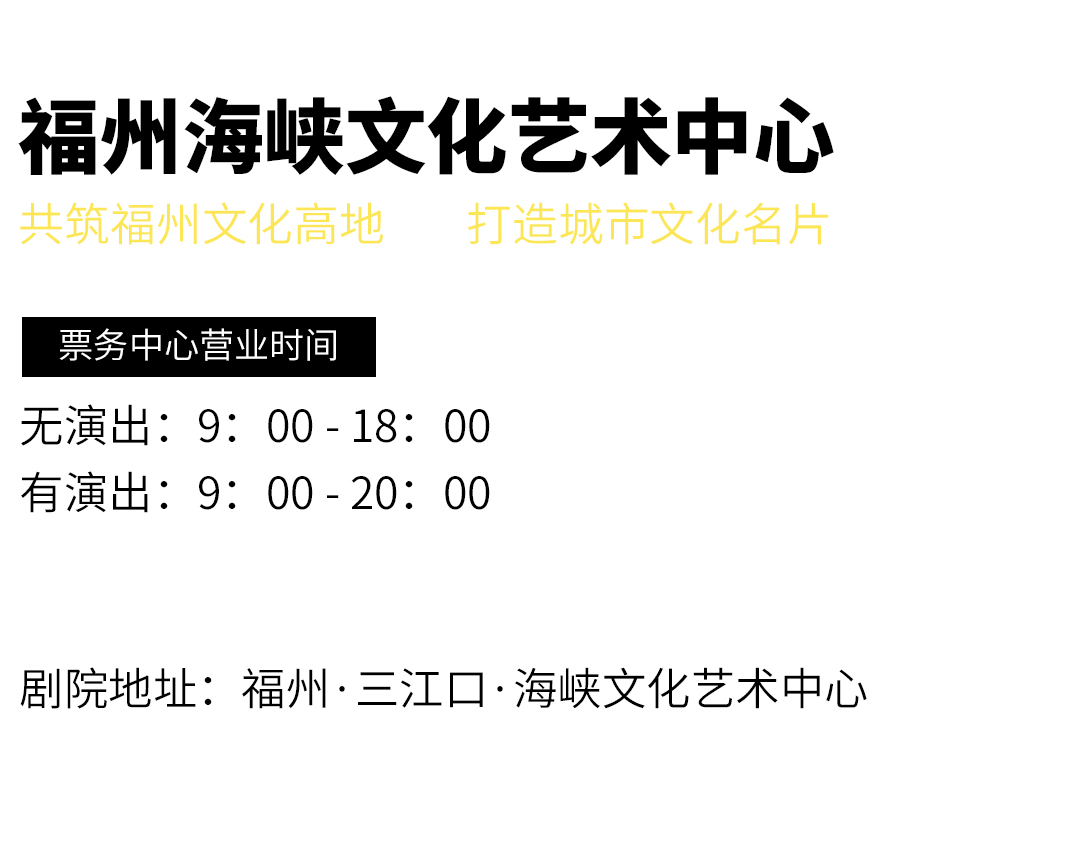 温馨提示:演出期间,停车免费,由于海峡文化艺术中心停车位有限,建议观看演出的朋友们提早到达,或尽量选择乘坐公共交通工具绿色出行。