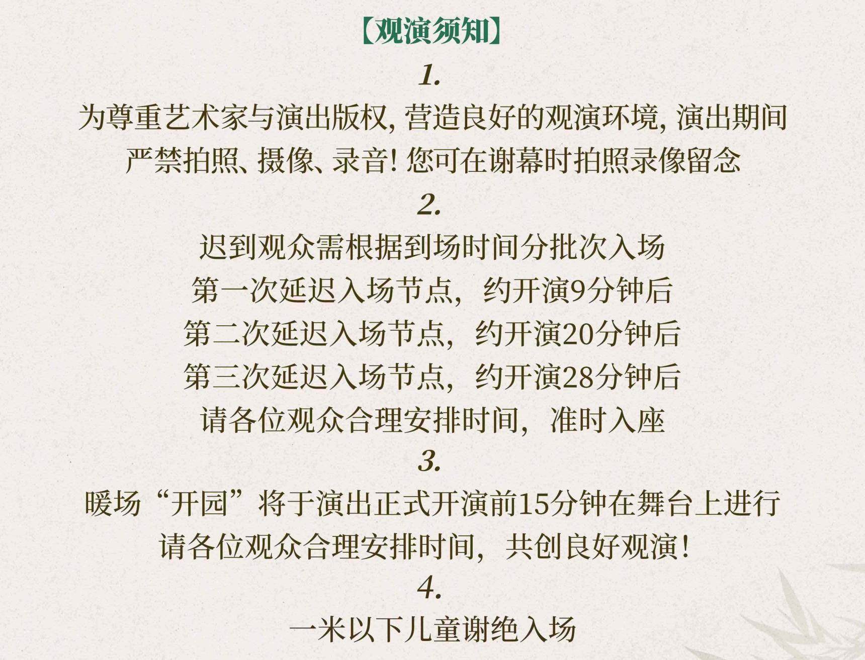 购买前请提前规划好行程,当天确保至少提前一小时到达现场,以免影响您正常观演,感谢您的理解与配合。