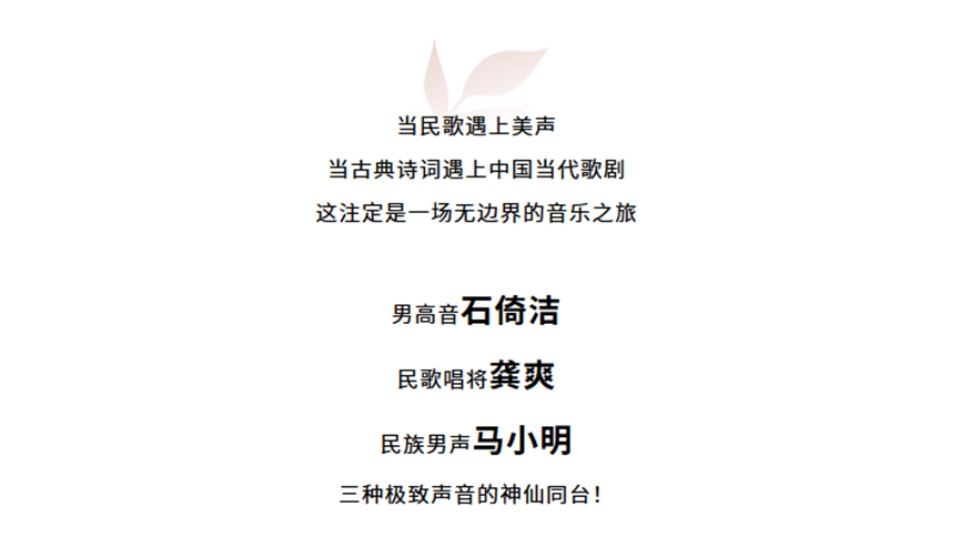 身为中国音乐文化艺术的传承者和传播者,三位艺术家心怀对中国声乐艺术佳作的无限热爱,共同发起了本场音乐会。从原汁原味的地方民歌到融合国风元素的原创古诗词歌曲,竭力为观众演绎传统与现代的兼容并蓄,体验民族&美声强强联合跨界带来的中国声乐艺术之美。无论唱法,声入人心,歌声亦无限。