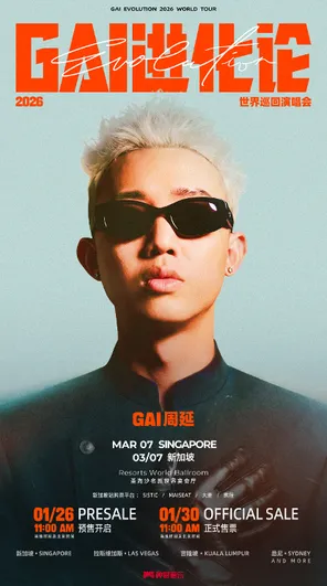GAI周延,新华流说唱领军人物,音乐风格自成一派,“超爽”现场极具感染力。2026年,《GAI进化论》2026世界巡回演唱会-海外巡演(GAI EVOLUTION 2026 WORLD TOUR)正式启动。时隔七年,中文说唱最强音将再次席卷全球!3月7日率先登陆新加坡 (Singapore),门票预售时间:1月26日11:00AM(当地时间及北京时间)/正式售票:1月30日11:00AM(当地时间及北京时间);演出场馆:Resorts World Ballroom 圣淘沙名胜世界宴会厅。新加坡首站特设站立区,让乐迷在最近距离感受声浪轰炸,与舞台同频共振,将互动距离拉近至极致。之后《GAI进化论》海外巡演还将陆续抵达拉斯维加斯 (Las Vegas)、吉隆坡 (Kuala Lumpur)、悉尼 (Sydney)等地,把中国龙的图腾,刻在世界版图之上!