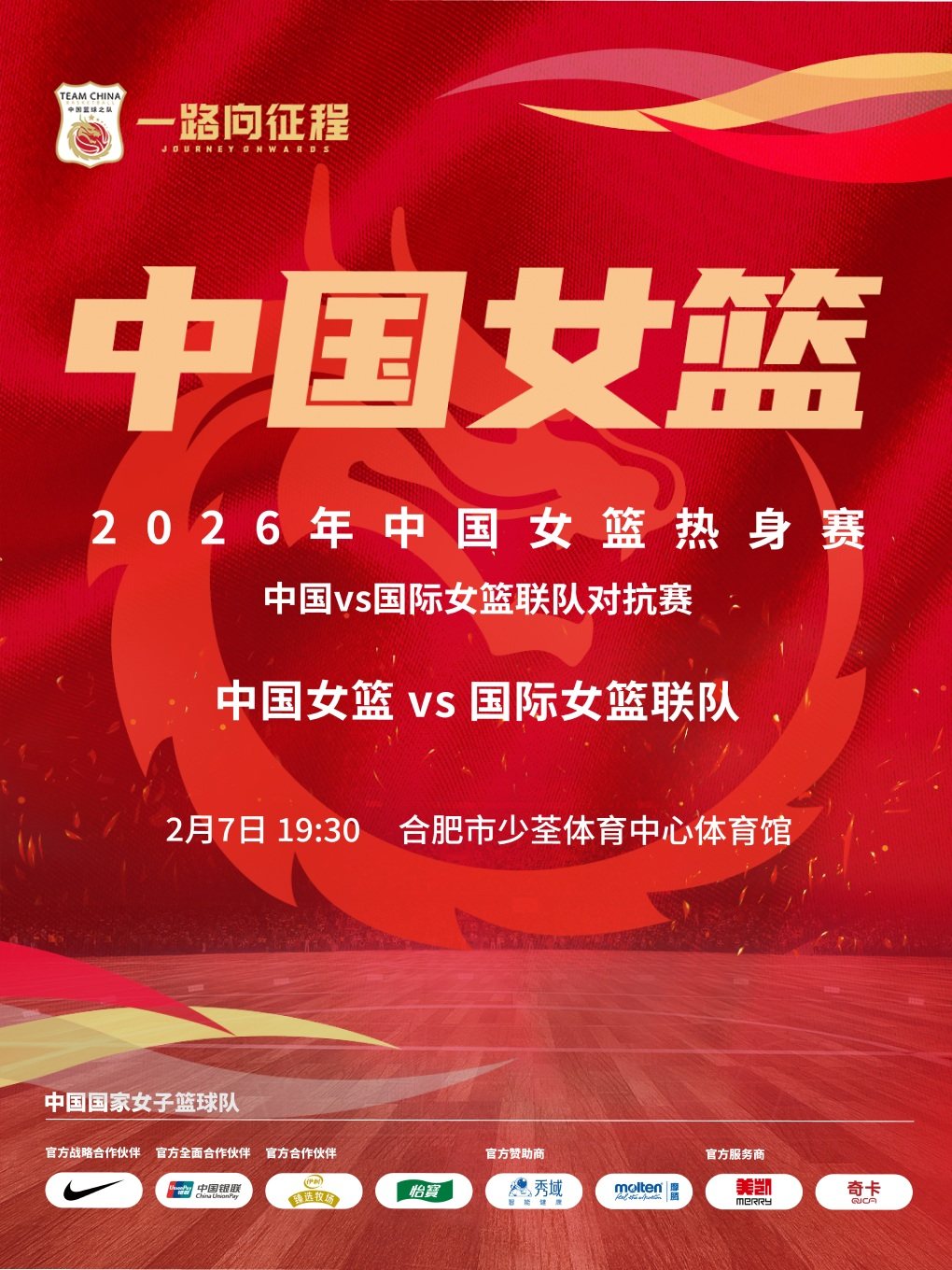 为助力中国女篮全力备战2026年国际篮联女篮世界杯资格赛,2月7号中国女篮将在合肥迎战国际女篮联队,现场将响起震耳欲聋的“中国队加油”呐喊,每一次精准传球、每一记果断投篮都将点燃全场激情,这场高水平国际赛事不仅是女篮姑娘们磨合战术、锤炼实力的关键练兵,更会让合肥观众沉浸式感受篮球运动的速度与力量,近距离见证中国女篮的拼搏风采,让我们一同赴约现场,为中国女篮呐喊助威!