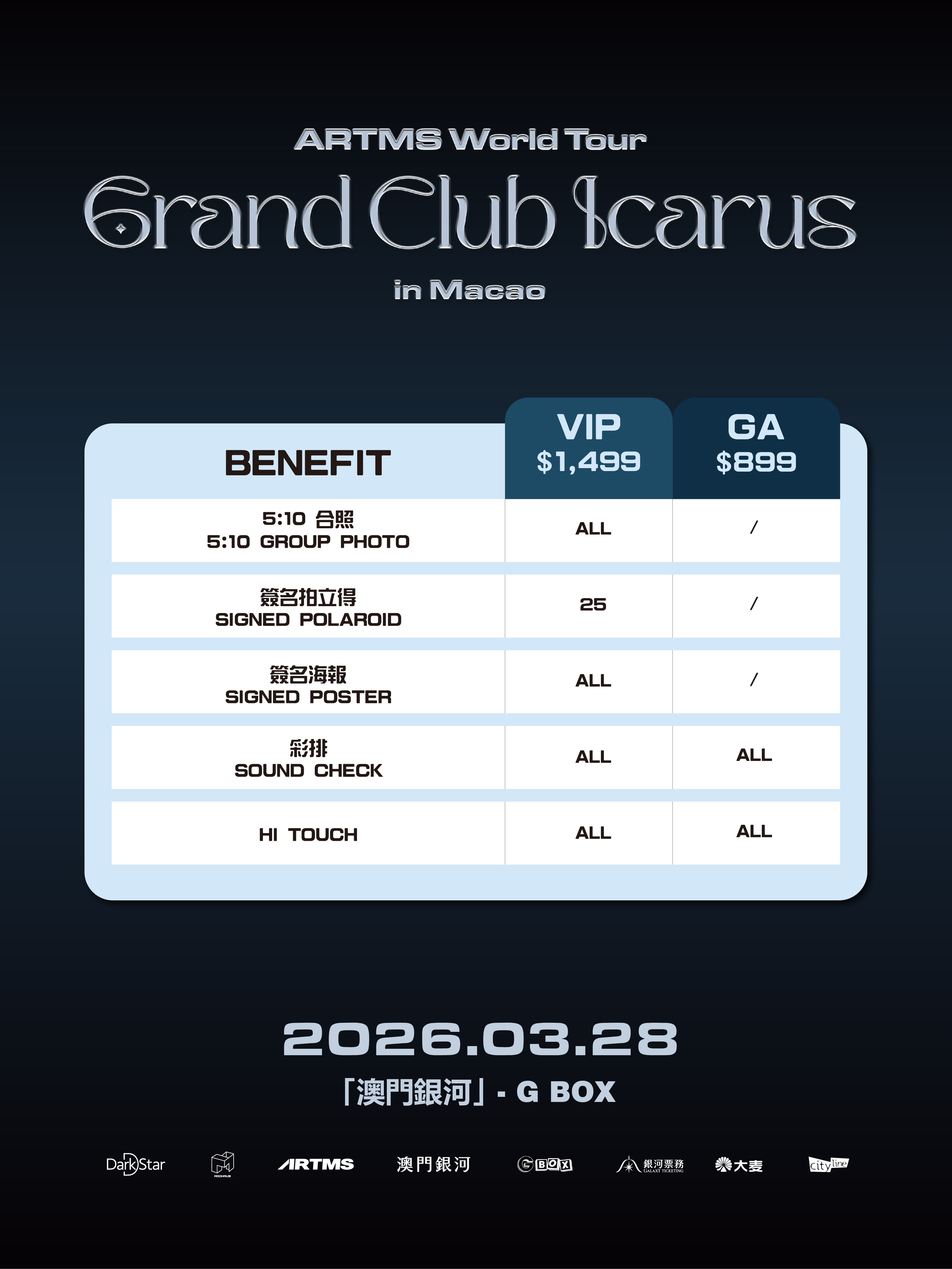 本次澳门站将呈现多首代表作品与特别舞台,展现 ARTMS 作为完整团体的音乐魅力与舞台实力,诚邀 OURII 一同登上《Grand Club Icarus》,见证属于 ARTMS 的飞翔时刻。