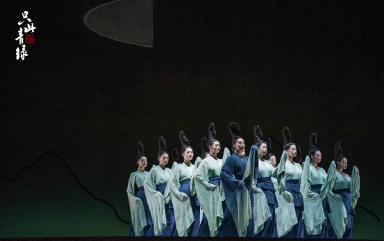 舞蹈诗剧《只此青绿》,取材自北宋希孟创作的绢本设色画《千里江山图》,全卷设色精妙、构图悠远、底蕴深厚,以烟波浩渺的江河、层峦叠嶂的群山构成一幅山清水秀的壮丽图景。通过“展卷、问篆、唱丝、寻石、习笔、淬墨、入画”等篇章为纲目,观众将跟随一位现代故宫研究员——展卷人的视角,徜徉在富有传奇色彩的中国传统美学意趣之中。“自可独步千载,殆众星之孤月耳”。《千里江山图》是北宋“青绿山水”的代表作,以咫尺之地展千里江山风光。舞蹈诗剧《只此青绿》,借助文化想象,通过舞蹈语言让文物“活起来”。舞台上,十二位舞者梳着高耸云际的“青峰髻”,身着青绿色曳地长裙翩翩起舞,仿佛《千里江山图》中层峦叠嶂的山峰,在高低错落间建构起立体的水墨时空。青绿在画中静待千年,又终归回归至画里,观众们激动地表示:“这不仅仅是一场舞蹈,更是一副活生生的山水画在舞台上的流动,无遮挡动作就像画笔一样,把古老的画卷画在舞台上”。