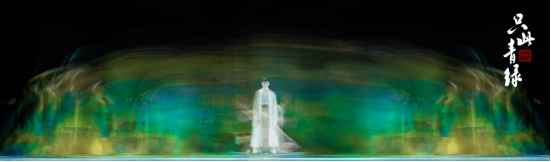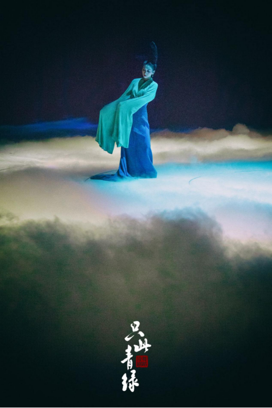 当一千多年前,十八岁天才少年希孟笔下的色彩,化作眼前亦近亦远的身影。青绿,以绚烂之身勾勒出如诗又如幻的无垠山河。女舞者饰演的“青绿”,是《千里江山图》历千年不褪的璀璨色彩之精魄,是脉脉相承的中华优秀传统文化的诗性表达。