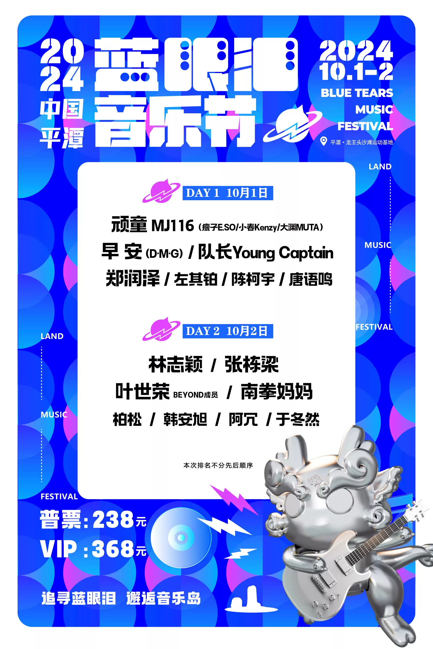 2、场地内人员密集,禁止携带帐篷宠物、小板凳、奶茶、 瓶装水、相机三脚架、雨伞(建议雨衣)、旅行箱、移动坐具、遥控飞行器(无人机)和轮车(含自行车、平衡车、滑板等)入场。充气沙发在特定的充气沙发区摆方,场地内不可过夜。