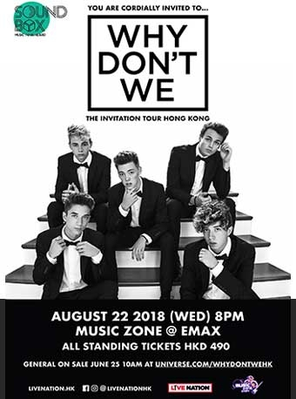 你已获邀出席这次盛事!疯魔全球的男子流行组合Why Don’t We (Daniel Seavey、 Zach Herron、Corbyn Besson、Jonah Marais和Jack Avery) 即将带同他们出道至今最 大型的巡迴演出 “The Invitation Tour” 首次来到香港,于8月22日假九龙湾国际展贸中心Music Zone@Emax 献上他们在香港的第一次演出!是次演出由 Live Nation的亚洲音乐品牌SOUNDBOX呈献,蒐罗全球最顶 尖的音乐才艺并带到亚洲。