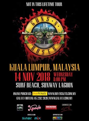 美国硬摇滚乐队 Guns N' Roses世界巡回演唱会《NOT IN THIS LIFETIME TOUR》马来西亚站震撼来袭,2018年11月14日(星期三)将以重金属摇滚燃爆吉隆坡双威水上乐园!