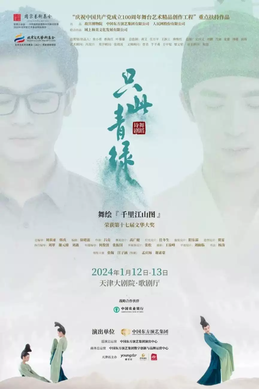 舞蹈诗剧《只此青绿》——舞绘《千里江山图》,由故宫博物院、中国东方演艺集团有限公司、人民网股份有限公司共同出品,域上和美文化发展有限公司联合出品,中国东方演艺集团演出中心总运营,北京保利剧院管理有限公司、北京四海一家文化传播有限责任公司等联合运营。