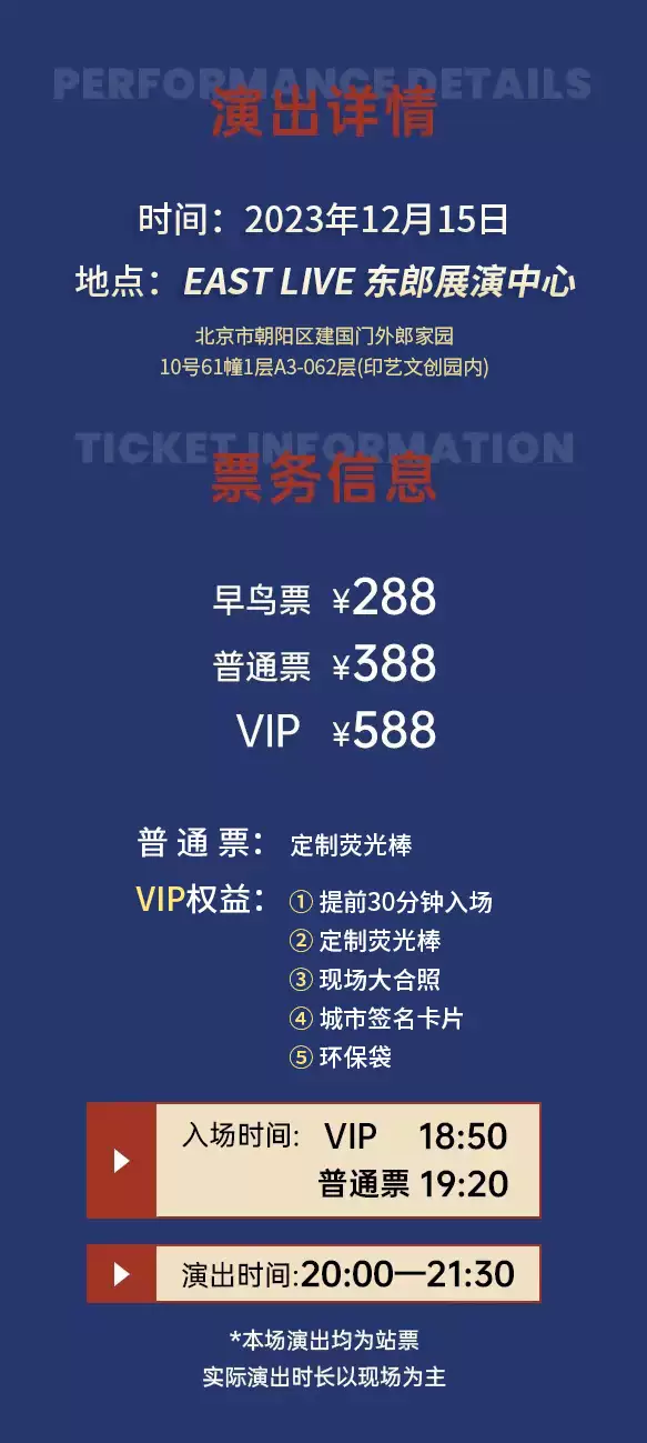 购买前请提前规划好行程,当天确保至少提前一小时到达现场,以免影响您正常观演,感谢您的理解与配合。